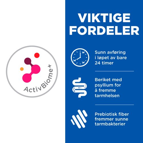 Kattens fordøyelseshelse kan bli negativt påvirket av mange ting, og når katten har fordøyelsesvansker er det en svært ubehagelig opplevelse for alle som er involvert. Den gode nyheten er at du kan hjelpe katten med å føle seg bedre med et fôr som revolusjonerer måten vi håndterer fiber-responsive mage- tarmproblemer ved å sette mikrobiomhelse - det unike økosystemet i tarmen til katten - i fokus ved mage-tarmpleie. Hill’s ernæringsspesialister og veterinærer har satt sammen Prescription Diet Gastrointestinal Biome ernæring med ActivBiome+, en unik ingrediensteknologi som er klinisk vist å fremme regelmessig, sunn avføring på så lite som 24 timer, og bidra til å redusere risikoen for tilbakefall.