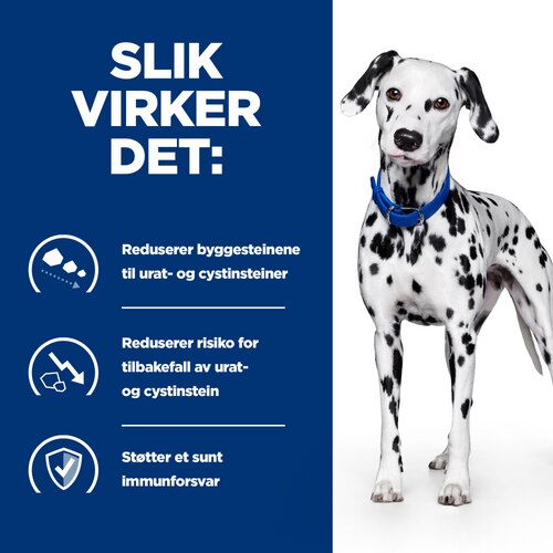 Hill's ernæringsfysiologer og veterinærer har utviklet Prescription Diet u/d klinisk ernæring spesielt formulert for å bidra til å støtte din hunds blærehelse.